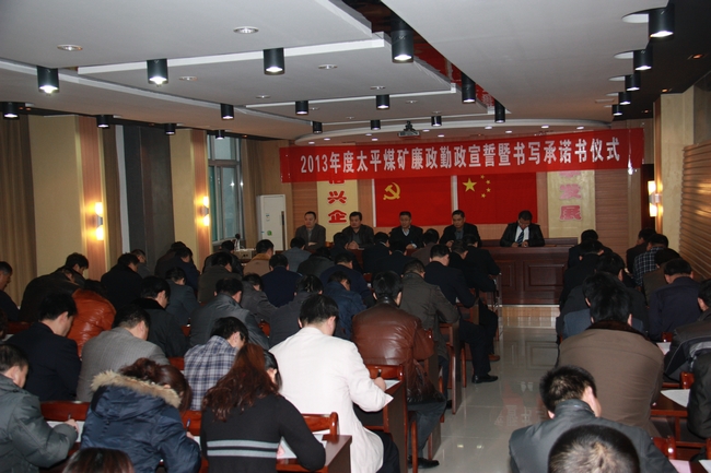 近日,太平煤矿在机关楼六楼会议室举行了2013年度廉政勤政宣誓和书写廉政承诺书仪式。矿领导班子成员、中层以上干部中的党员和“三管”人员中的党员共86人参加了会议。与会人员亲笔书写了廉政承诺书并面向党旗、国旗庄严宣誓。鲁泰煤业副总经理、矿长王付清同志作了重要讲话,党委书记刘岭同志主持会议。